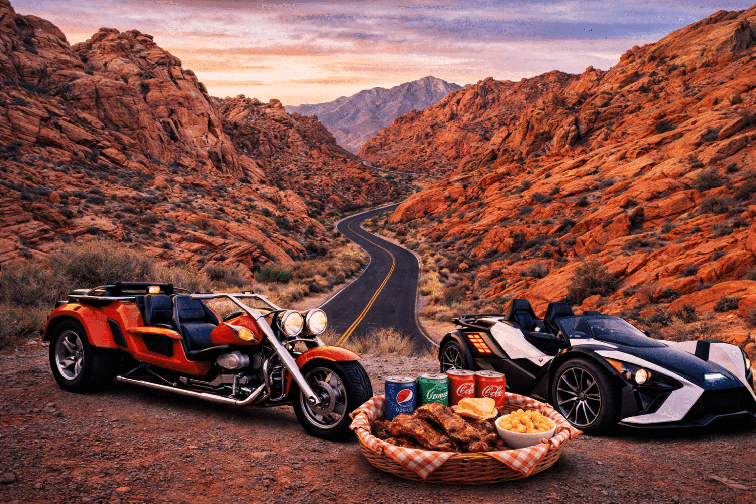 Ride a Polaris Slingshot or Trike through Las Vegas to enjoy a delicious BBQ lunch and a stop at the famous Pawn Stars shop from the hit TV show. Then continue your adventure to the stunning red cliffs of Red Rock Canyon for incredible desert scenery and unforgettable photo opportunities. A fast, fun Vegas experience perfect for guests who want big scenery and excitement in just a few hours.